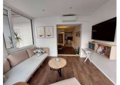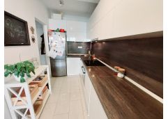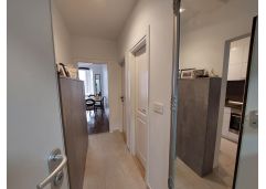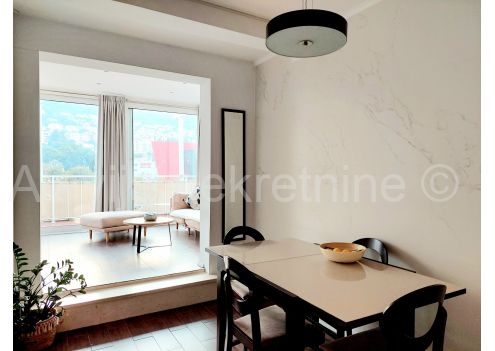 Stan uknjižen kao poslovni prostor od 60 m2 i 25 m2 terase, u većem stambenom-poslovnom objektu , na četvrtoj etaži, novo uređen i prodaje se opremljen. Sastoji se od dvije spavaće sobe, dnevnog boravka, kuhinje, hodnika, kupaonice s wc-om, ostave i terase.