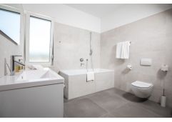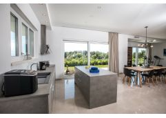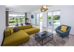 The villa has a kitchen, a living room with a seating area and a dining area, 4 bedrooms, and 4 bathrooms with a shower and a bath.